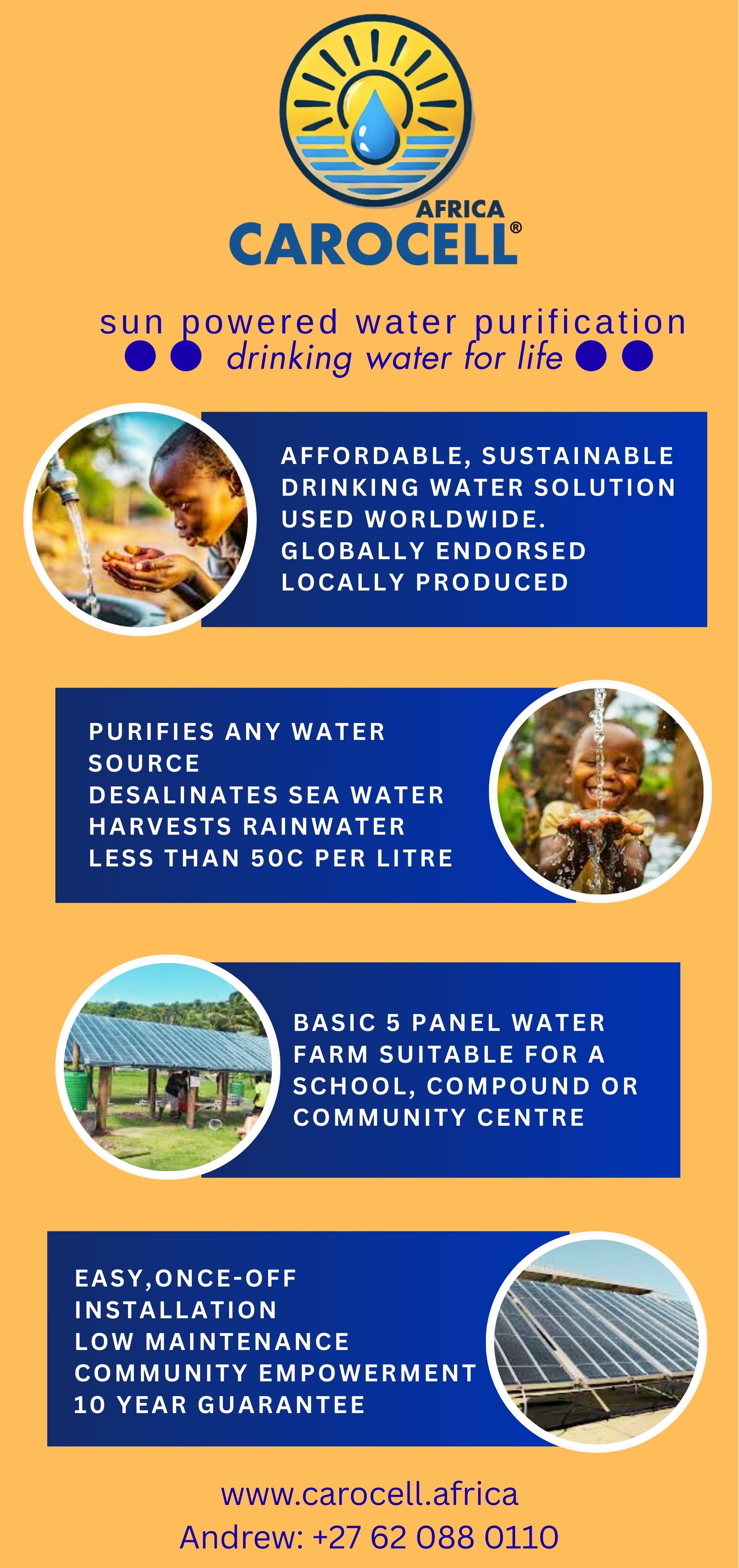 Carocell is at the forefront of advancing water conservation and purification technologies through its innovative solar distillation and desalination systems. Our cost-effective solutions are designed to produce clean drinking water from a variety of sources, making them particularly beneficial for off-grid communities in rural settings. With a proven track record of over 3,000 installations across more than 30 countries, we collaborate with global organizations to ensure access to safe drinking water derived from seawater, groundwater, and contaminated sources. Our systems are not only chemical-free and easy to install but also equipped with monitoring capabilities for effective record-keeping and impact assessment. Additionally, the implementation of a pre-paid meter/token system aids in minimizing water wastage while boosting community confidence in water access. Our 5-panel waterfarm solution is ideal for rural schools and can be adapted according to evolving demand, highlighting our commitment to sustainable water solutions. As a proud member of the Tombolo Africa group, Carocell continues to make strides in enhancing water accessibility through solar-powered technologies.