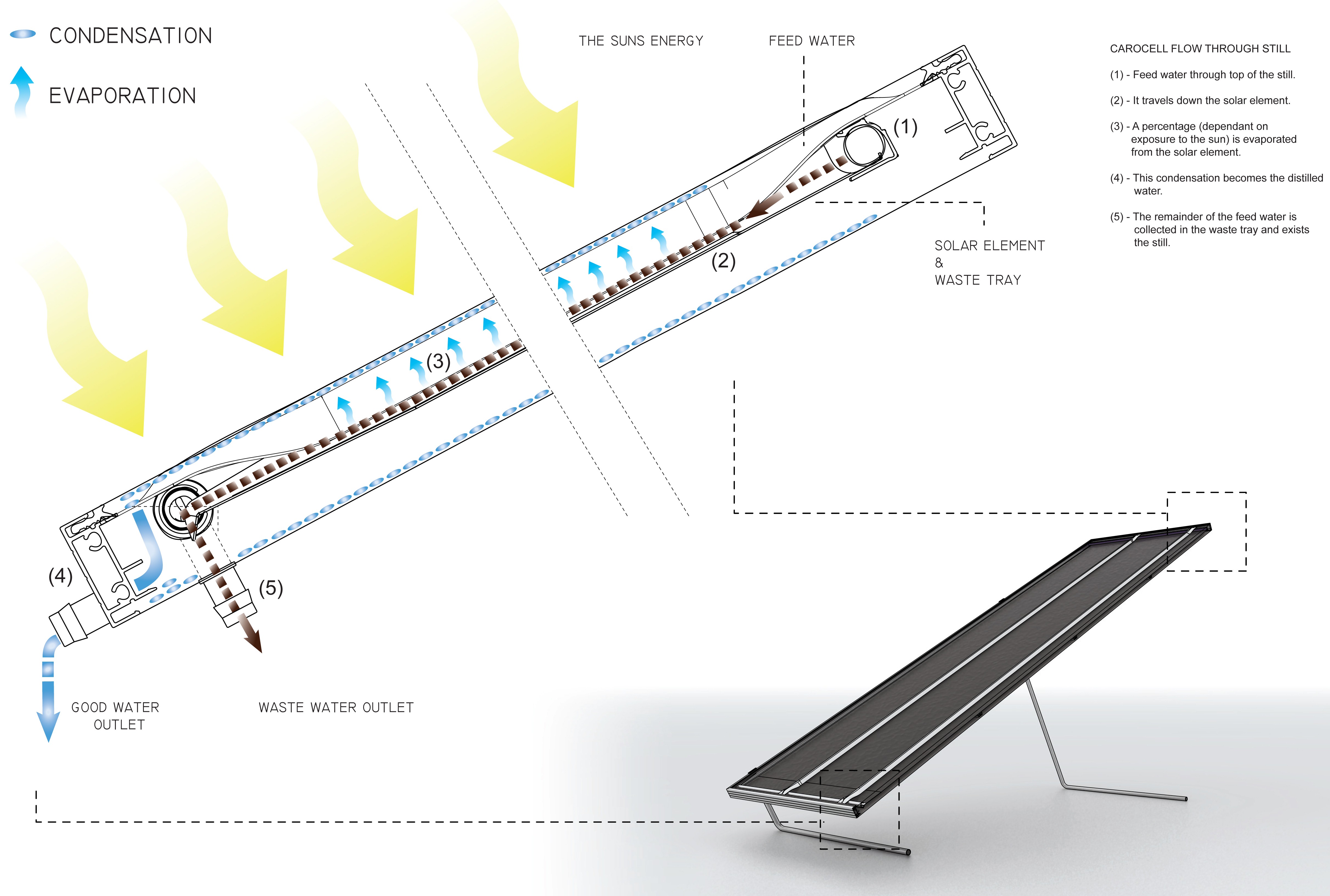 The Carocell Solar Purification Water Farm is an off-grid, solar-powered system that produces safe drinking water from seawater, brackish water, polluted surface water, groundwater, and rainwater. The system uses a proven thermal distillation process, where solar heat evaporates contaminated source water and condenses it into purified, potable water. Because solids, salts, metals, and pathogens cannot evaporate, they are left behind, resulting in clean water suitable for drinking, cooking, washing, and cleaning.